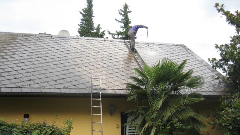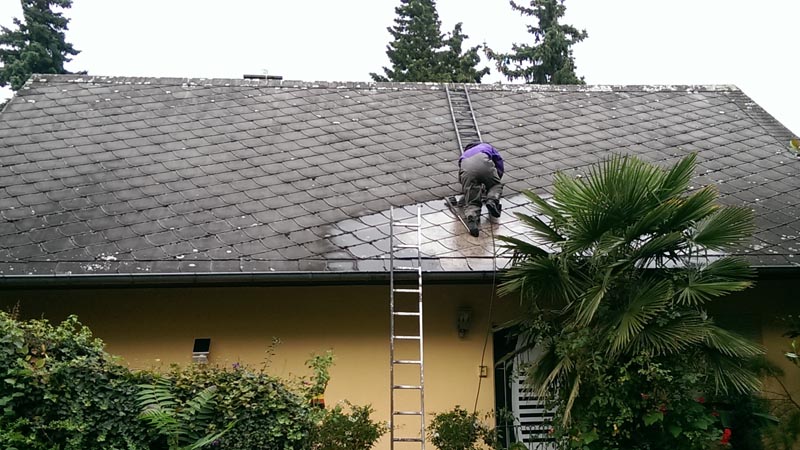 Erst dann kann mit einer professionellen Reinigung begonnen werden. Die Dachreinigung erfolgt ausschließlich mit Wasser, ohne chemische Zusätze. Mit Hochdruckreinigern (nicht bei asbesthaltigen Dacheindeckungen) wird das komplette Dach gereinigt. Hierdurch erhält die alte Dacheindeckung eine glatte Oberfläche. Moos, Pilz und Algen wird es dadurch erschwert, sich auf der glatten Oberfläche erneut festzusetzen.